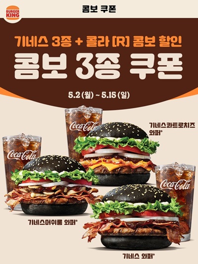 각종 콤보 쿠폰을 나눠주는 것도 있습니다. 기네스와퍼, 기네스머쉬룸와퍼, 기네스콰트로치즈와퍼 이렇게 3개의 기네스 시리즈의 단품 가격에 콜라를 무료로 얹어 먹을 수 있습니다. 이것 뿐 아니라 잔망루피 슈림프버거 3종은 무료 세트업 쿠폰을 주고 있어요. 이때의 세트는 감자튀김이 아니라 어니언링(양파링)을 제공해 주는 구성이에요.