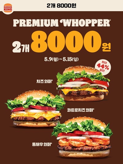 버거킹 5월 9일 행사는 프리미엄 와퍼 2개 8000원이에요. 통새우와퍼, 콰트로치즈와퍼, 치즈와퍼 중 2개를 골라서 8000원에 먹을 수 있습니다.