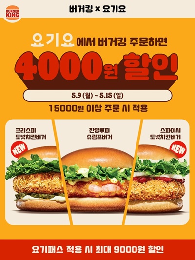 요기요에서 4000원 할인해 주는 행사도 하고 있어요. 15000원 이상 주문할 때 4천원을 할인해 줍니다. 요기패스까지 가입하면 최대 9000원까지 할인이 된다고 합니다. 이 정도면 할인받아서 주문하는 것도 나쁘지 않네요. 다만, 버거킹에서 마구 퍼주는 쿠폰을 적용하지는 못하는게 아쉽기는 합니다.