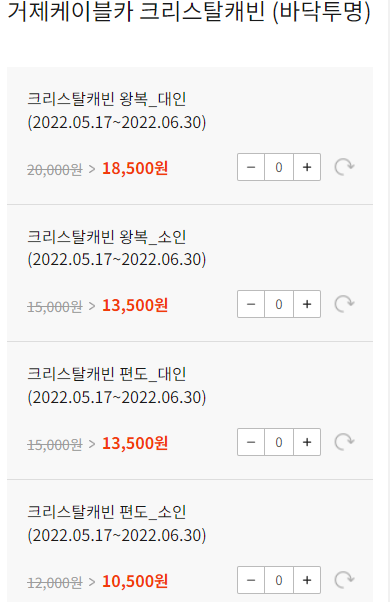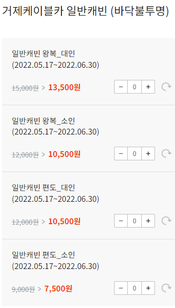 가격은 대인기준으로 왕복 요금은 일반 캐빈은 대인 15000원, 소인 12000원이고 크리스탈캐빈은 대인 20000원, 소인 15000원입니다. 소인의 기준은 초등학생까지이고 중학생부터는 대인으로 분류됩니다.